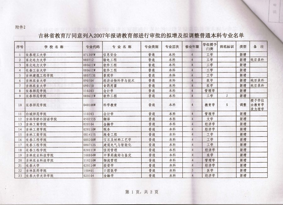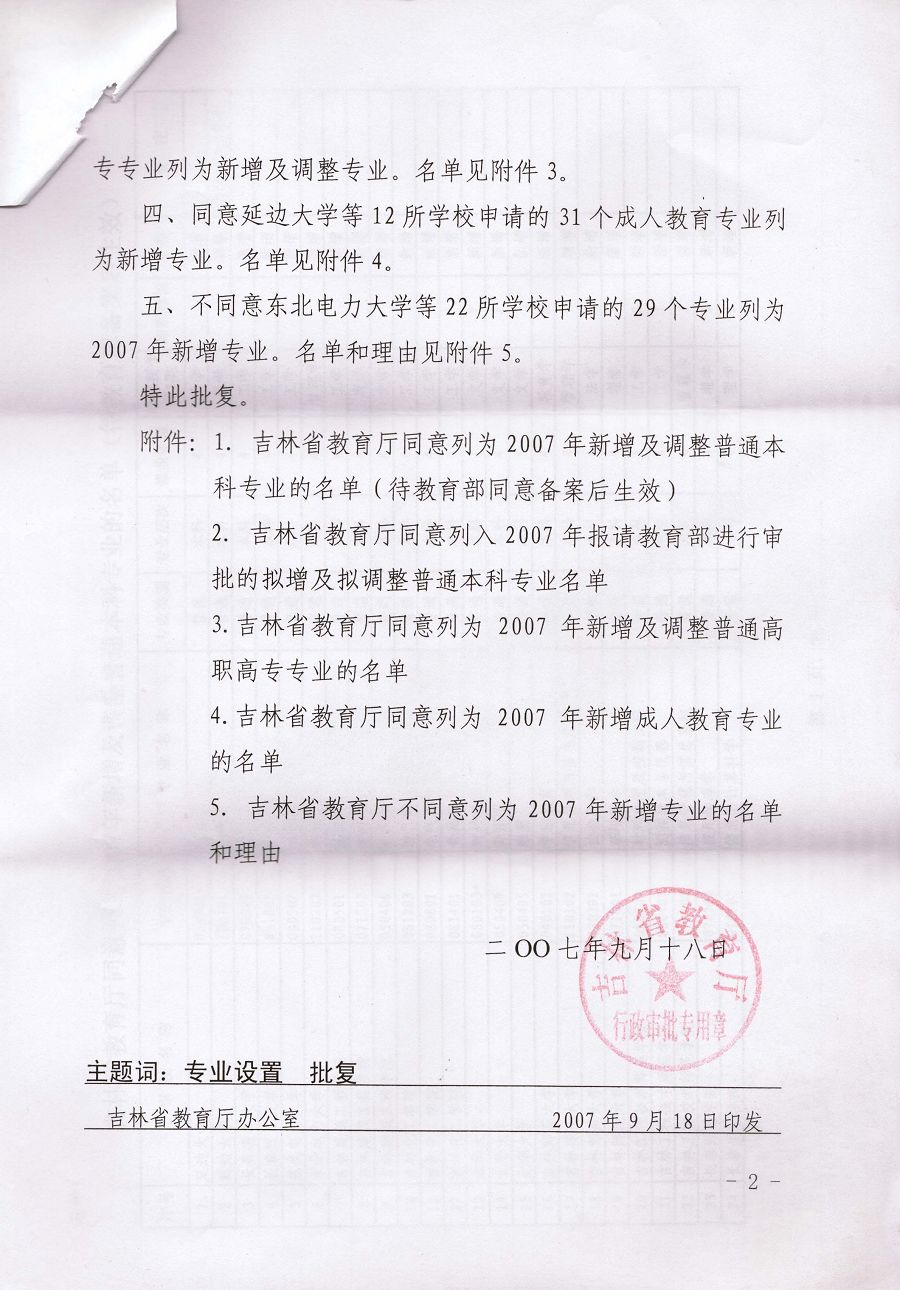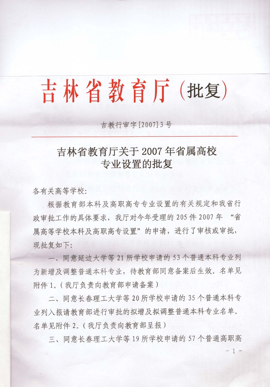 吉林省教育厅关于2007年省属高校专业设置的批复