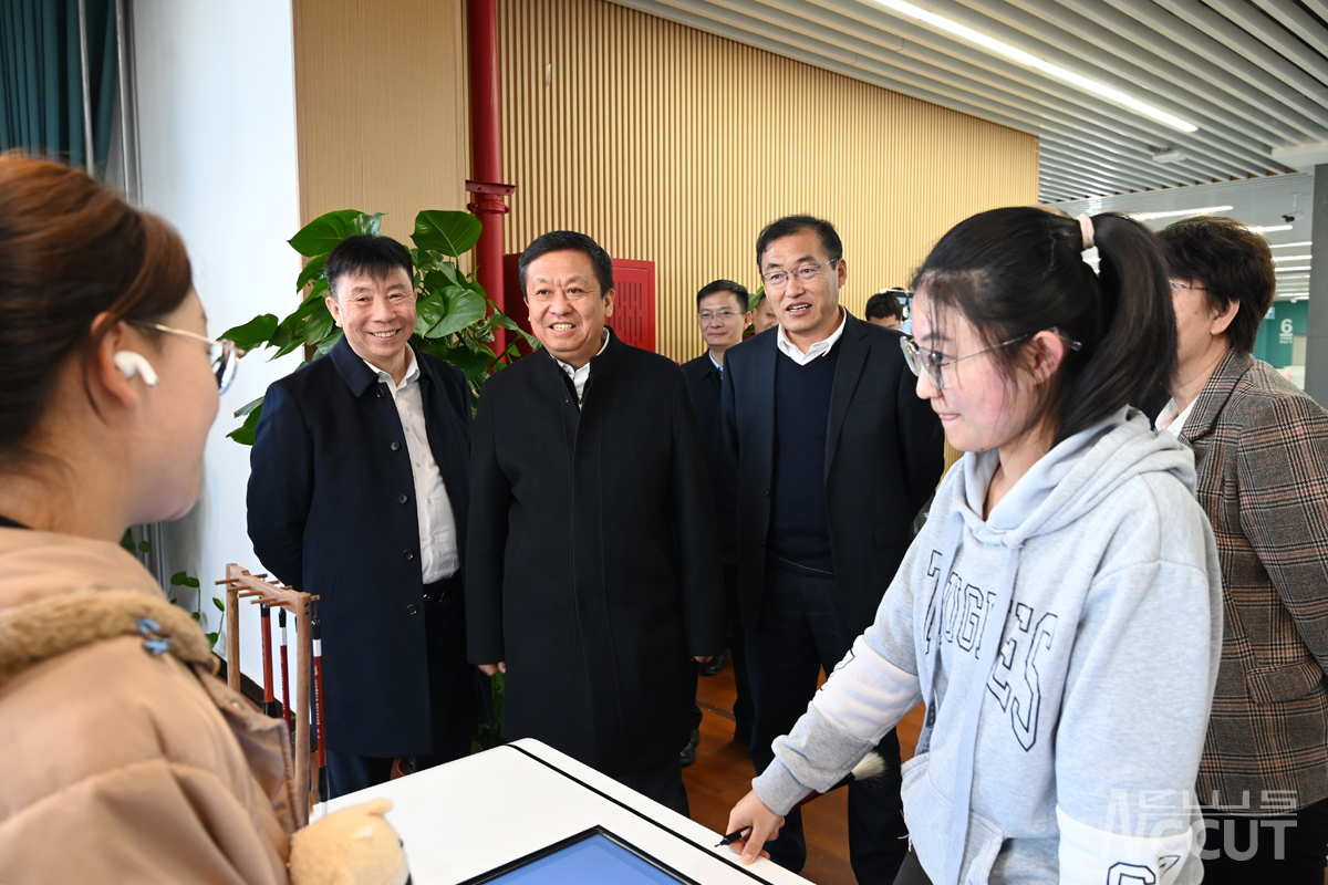 在北湖校区东区红色文化主题教育践习中心,李国强听取了中心建设情况,调研了部分展馆,详细了解了学校首任校长郭力先生事迹、学校发展历程、人才培养和服务地方经济社会发展情况。在德育馆,看到学校将中华优秀传统文化、中国共产党人的精神谱系与大学生思想政治教育深度融合,形成特色育人体系时,李国强充分肯定了学校以最贴近学生的方式持续开展“润物细无声”的思想政治教育的理念,强调要将中华优秀传统文化融入社会主义核心价值观教育,赋能思政教育,实现知识传授与价值引领的有机统一,提高学生的文化素养,厚植家国情怀,增强文化自信。