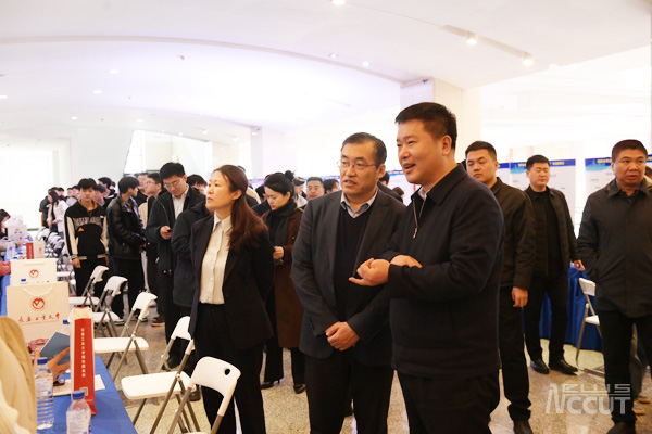 与会领导参观招聘会现场,与招聘单位工作人员和毕业生们亲切交流,询问同学们求职意向和签约状况。