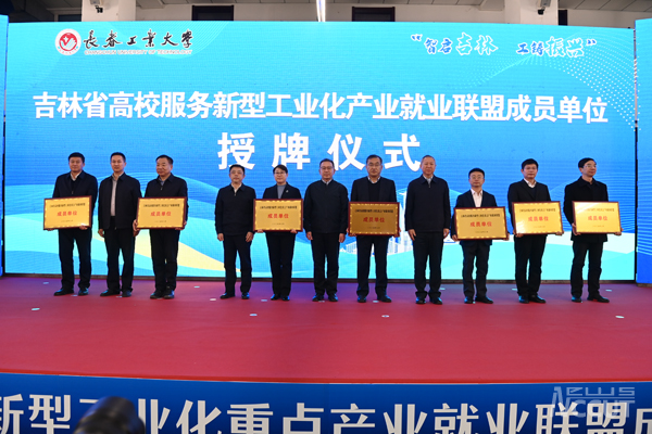 在就业联盟启动仪式上,校长张明耀与长春理工大学党委副书记刘瑛,长春工程学院副校长尹志刚,吉林化工学院党委副书记李士阳,东北电力大学党委常委、统战部部长、招生就业处处长许波,吉林电子信息职业技术学院副校长于钧,吉林工业职业技术学院副校长许跃共同按下启动键,就业联盟正式成立。启动仪式后,与会领导为成员单位授牌。